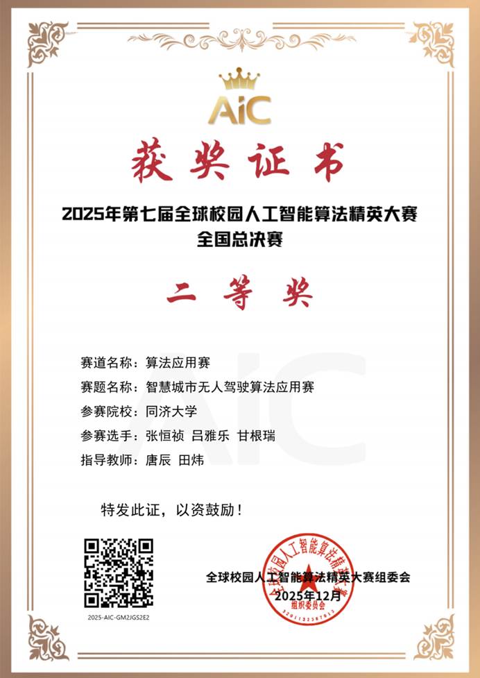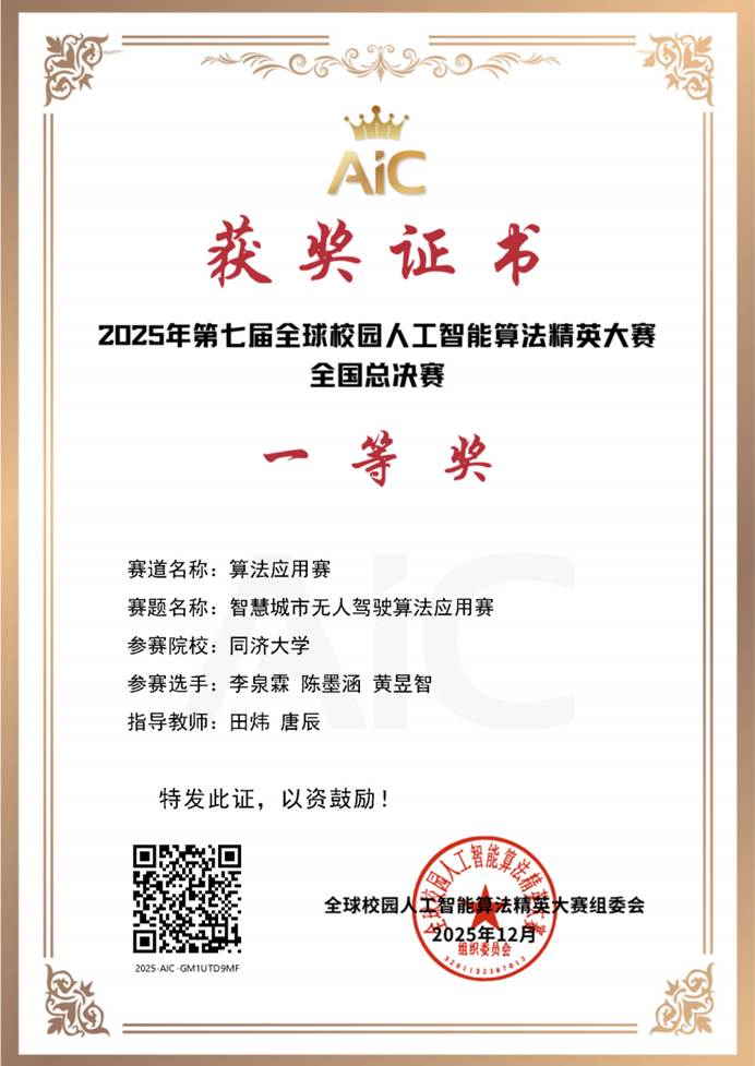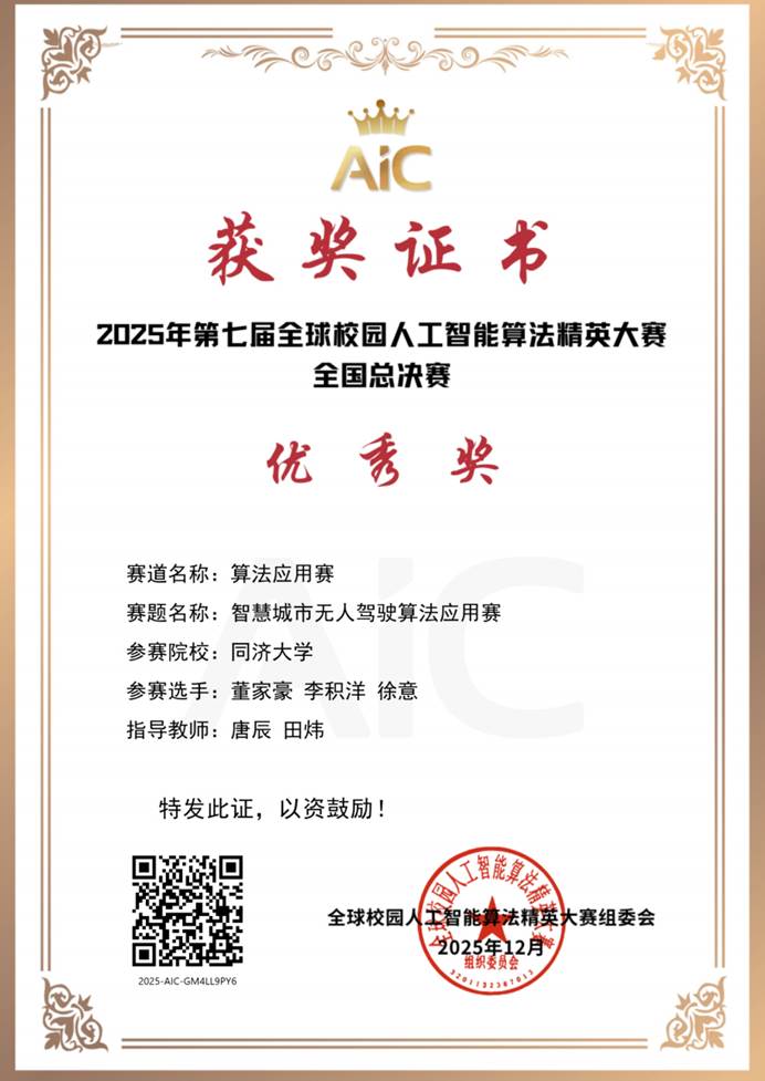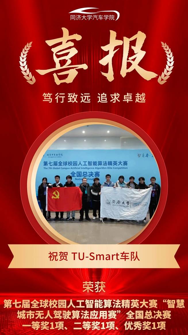 12月7日,第七届全球校园人工智能算法精英大赛 “智慧城市无人驾驶算法应用赛”赛项 全国总决赛于北京邮电大学顺利举行。同济大学TU-Smart智能车队的三支参赛队伍凭借出色表现,全员获奖。经过顽强拼搏,最终取得一等奖1项、二等奖1项、优秀奖1项的优异成绩。其中,同济大学TU-Smart A队荣获该赛项全国第四名,单赛项成绩创下同济大学历史最佳纪录!