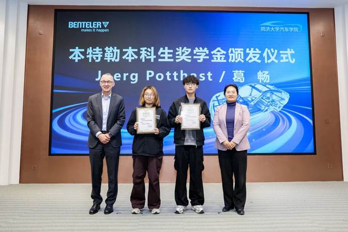 随后,举行本特勒研究生、本科生奖学金颁发仪式。施宏与熊璐共同为研究生奖学金获奖同学颁发证书,Joerg Potthast与葛畅共同为本科生奖学金获奖同学颁发证书,对在科研创新、学习成绩和综合表现方面突出的同学予以表彰。