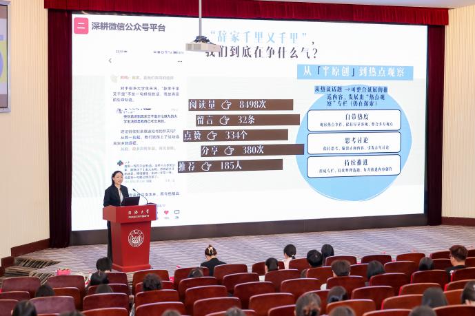 下午的会议中,同济大学团委宣传部副部长黄晓盈分享了“青春同济”公众号专栏建设、宣传员队伍建设、同济大学团委官网焕新、《同济大学生》报复刊工作的进展与经验。