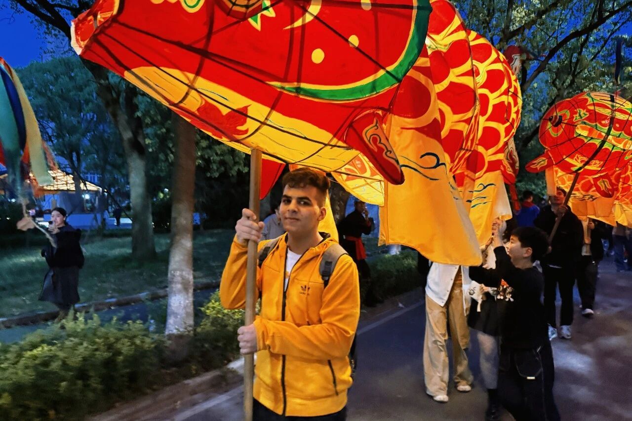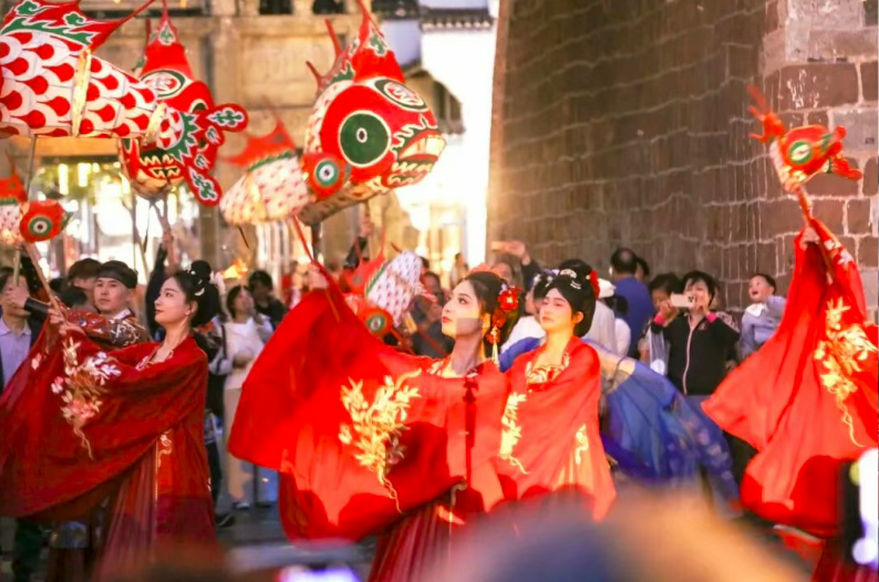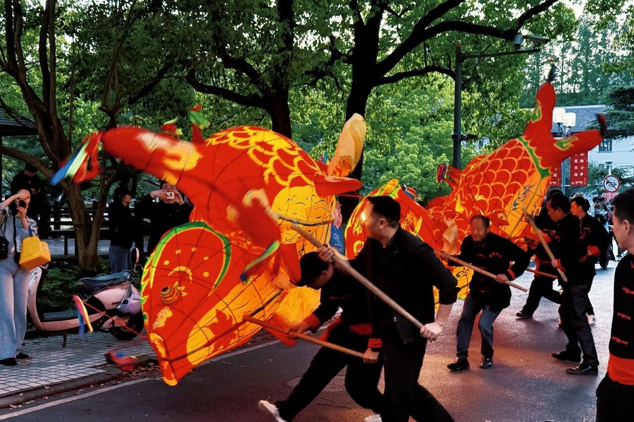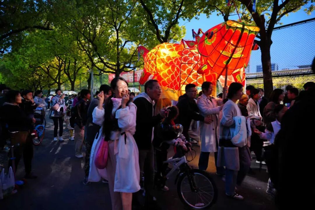 创意市集上,徽墨歙砚在指尖流转出墨韵书香,非遗鱼灯、徽州剪纸在光影交错中诉说匠心传承;舞台上,徽剧《百花赠剑》水袖翻飞间尽显古腔雅韵,情景剧《鱼灯谣》以温情叙事重构非遗表达,当夜幕降临,瞻淇鱼灯在校园中蜿蜒游走,同济学子手持鱼灯汇入巡游队伍,灯影与笑脸交相辉映,古老的祈福仪式在Z世代的欢呼声中完成了最具生命力的当代表达。