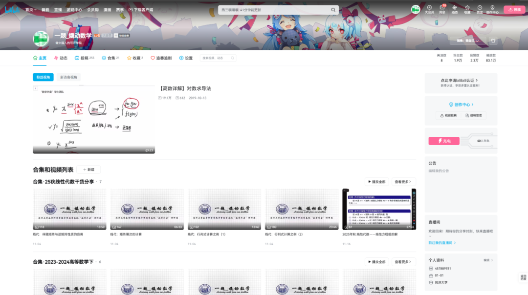 在B站“一题_撬动数学”账号上,推出了涵盖知识点精讲、典型题解析等内容的系列视频,以及各次讲座的完整录像,形成《高等数学》《线性代数》等课程合集。