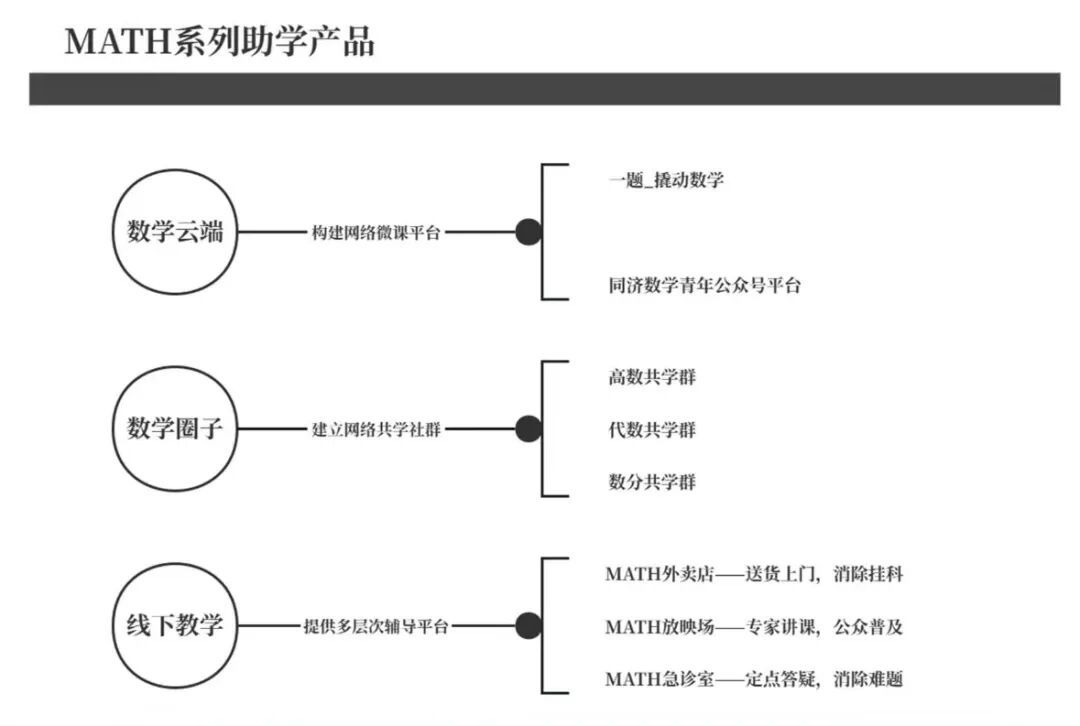 经过多年的迭代发展,项目形成了“数学云端+数学圈子+Math外卖店/放映厅/急诊室”的全场景服务矩阵。从知识输入的讲座、视频,到练习巩固的习题集、答疑,再到答疑解惑的线下急诊室、线上共学群,全方位覆盖了同学们数学学习的各个环节,极大提升了用户粘性,使同学们在数学学习的每个阶段都能获得相应的支持。