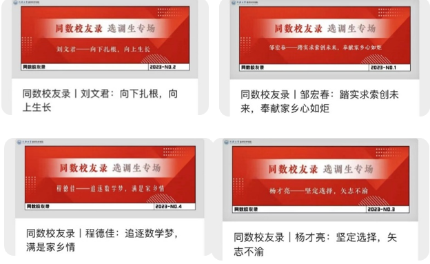 发挥优秀毕业生作用,利用学院公众号开辟“致远青年说”栏目,邀请优秀毕业生讲述成长故事和经验,累计推送73篇,阅读人次10w+。