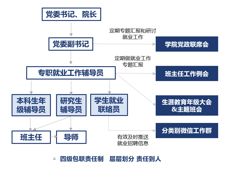 推行“分级包联责任制”,由党政领导、班主任、导师、辅导员、就业联络员组成帮扶团队,对每一位学生的去向意愿、就业卡点进行跟踪,每月更新进展,确保责任到人、不留死角,形成专职就业指导的辅导员为主,年级辅导员、班主任和就业联络员(学生)辅助模式的就业工作队伍格局。