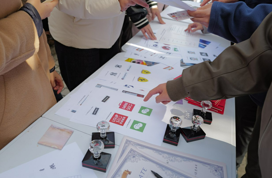 “知识产权辨识”模块的指认“假冒商标”和“盗版图书”游戏成为现场一大亮点。参与同学从卡片组中随机抽取7张印有各类商标和盗版图书的卡片,快速进行辨识判断。这一游戏不仅能提高同学们对假冒商标和盗版出版物的警觉度,减少因购买假冒商品而面临的经济损失和潜在风险,还能引导师生支持正品,进一步营造尊重知识产权、维护市场秩序的良好氛围。
