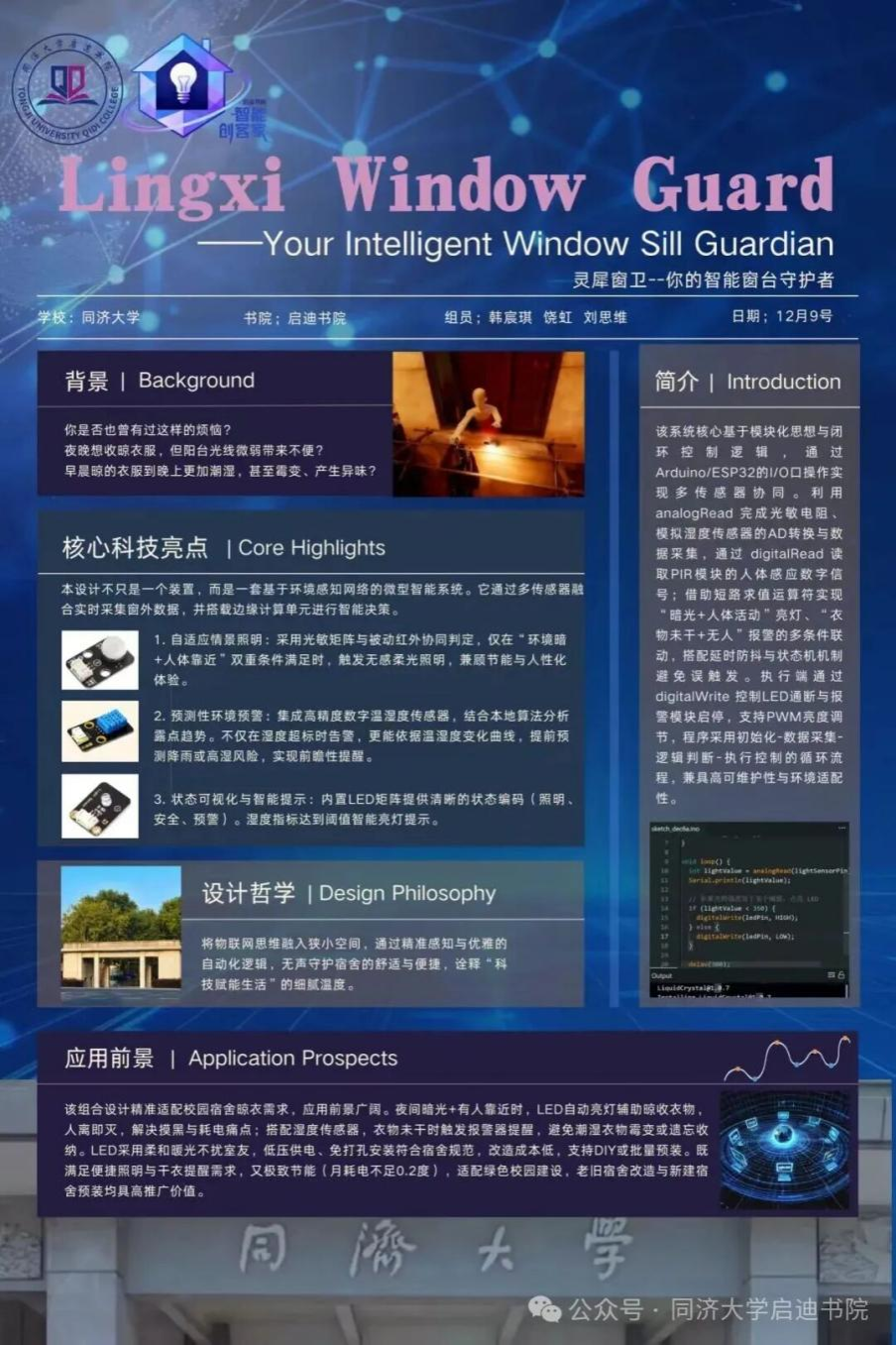 “灵犀窗卫”是一款由启迪书院学生设计的智能窗台守护系统,旨在解决宿舍阳台夜间光照不足、衣物潮湿霉变等生活痛点。该系统集成光敏、红外、温湿度等多类传感器,通过边缘计算实现智能决策:在暗光且有人靠近时自动点亮柔光照明;基于温湿度变化预测降雨或高温风险,提前预警。采用模块化设计与闭环控制逻辑,以Arduino/ESP32为核心,兼顾节能与人性化体验。装置支持状态可视化提示,安装简便、功耗极低,适用于宿舍、楼道等场景,以细腻的科技赋能日常生活的便捷与舒适。