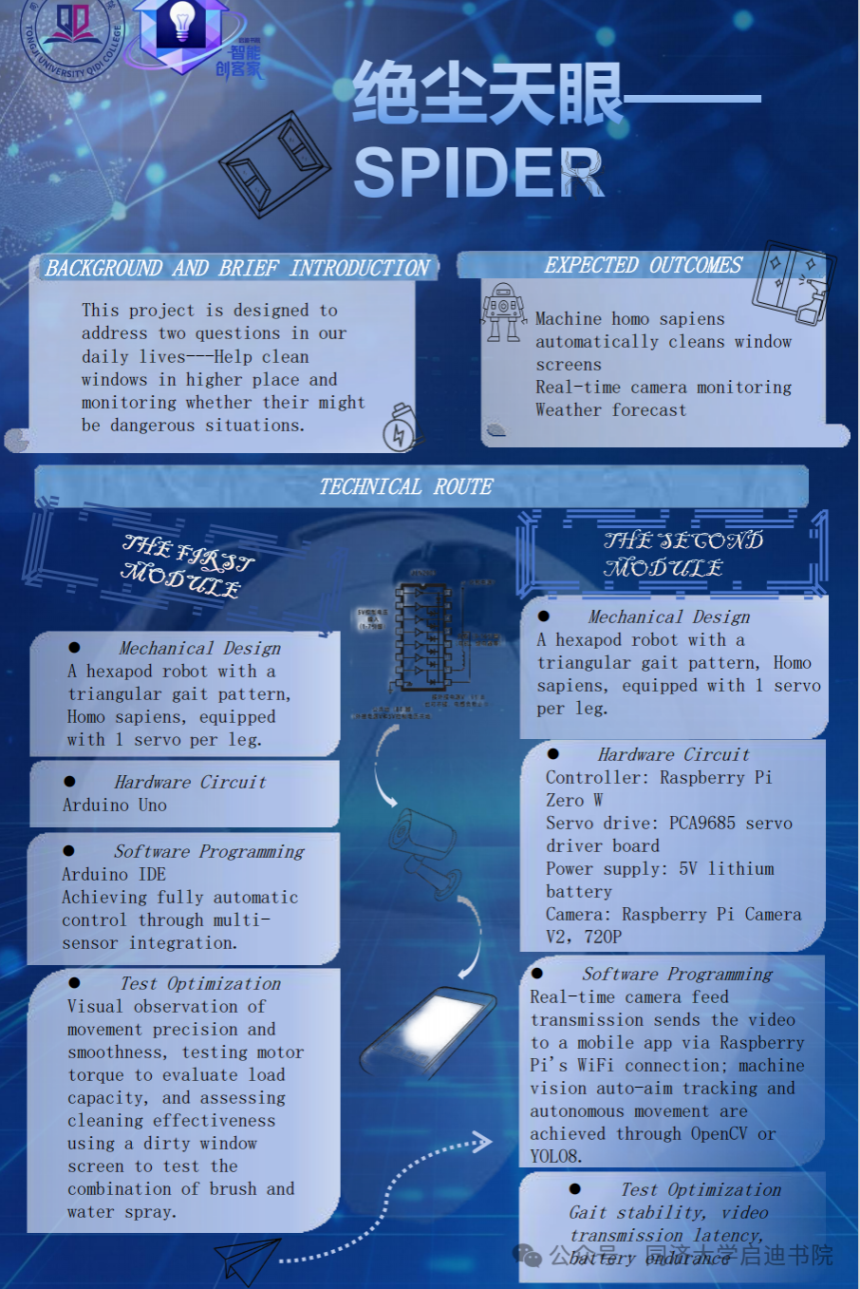 “绝尘天眼spider”旨在解决宿舍及教学楼窗户清洁难、安全监测不足等问题。