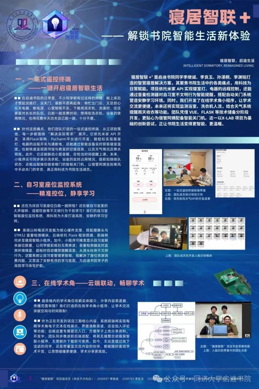 “寝居智联 +” 是启迪书院同学李继诚、李良玉、孙湛桐、李渊铭打造的智慧寝居解决方案,其聚焦书院生活中的各类痛点,用科技为日常赋能。项目依托米家 API 实现寝室灯、电器的远程控制,还能通过音量检测器对自习室不文明行为智能提醒,搭配自习室占用检测营造智能、高效的学习环境。同时,团队开发了在线学术角小程序,让学术交流更便捷,未来还将实现监测浴室、洗衣机人流,结合天气系统提醒雨天收衣等功能。团队凭借 Vue、Flask 等技术储备分阶段开发,技术路线丰富。这一以X-lab 项目为基础的创新尝试,正让书院生活变得更智能、更温暖。