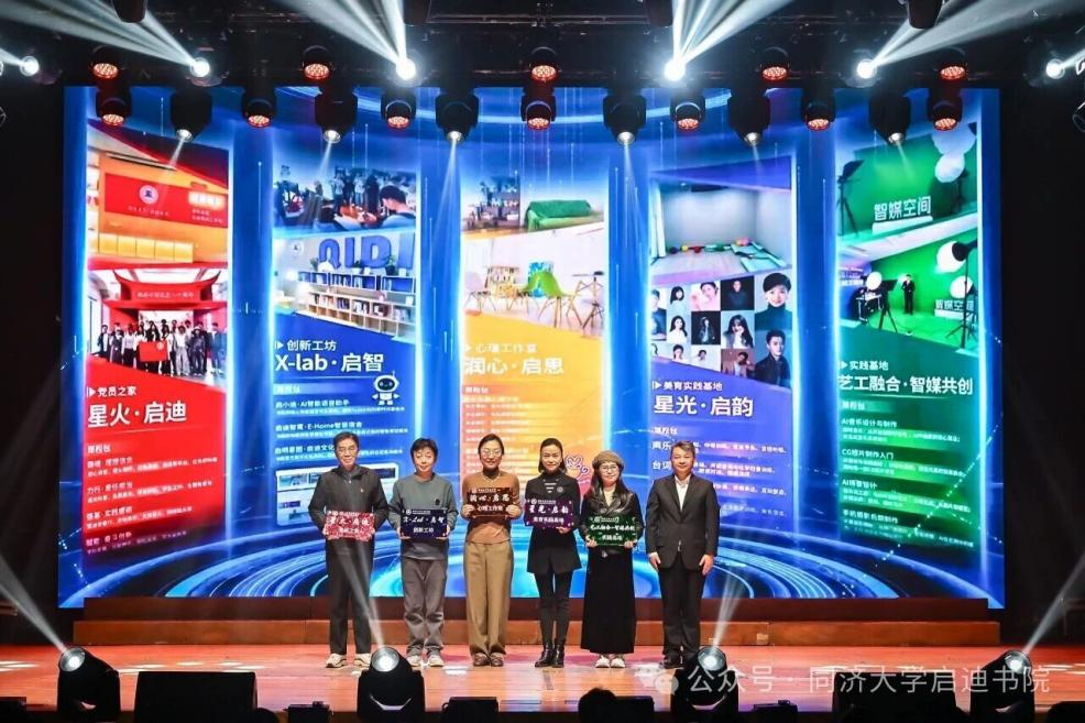 启迪书院自成立起便秉持“五育并举”理念,精心打造“星火·启迪”党员之家、“X-Lab·启智”创新工坊、“润心·启思”心理工作室、“星光·启韵”美育实践基地、“艺工融合·智媒共创”实践基地,配套设置五大课程包,特别邀请5位深耕教育一线、兼具专业素养与育人情怀的优秀教师担任各基地指导老师,共同为“启迪书院五育融合培养计划”按下启动键。校党委副书记刘润教授上台为五大育人实践基地授牌。